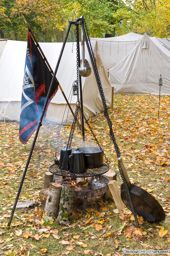 Gegenüber dem Musentempel am „Weißen Haus“, direkt am Seeufer und unter einigen großen Bäumen, hatte das „Freikorps von Lützow“ seine Zelte aufgeschlagen. Der Lagerplatz passte perfekt zur dargestellten Einheit, handelte es sich doch um keine reguläre Truppe, sondern Freiwillige, die aus Ihrem Hintergrund und Einsätzen begründet, von strikten Reglements und festen Lagerregeln eher wenig hielten. So waren mehrere Gruppen Zelte eher locker im frischen Herbstlaub arrangiert worden. Die Darsteller des Freikorps von Lützow kommen wie in der Historie aus ganz Deutschland. 11 Gruppen stellen die einzelnen Kontingente dar, von denen sich in Leipzig ein halbes Dutzend eingefunden hatten. Neben den Rheinländern, deren Gast wir sein durften, befanden sich Detachements aus Torgau und Leipzig (Tiroler Jäger). Kleine 2-Personenzelte sah man ebenso, wie große Behausungen – ideal, um sich unter der schützenden Plane auch bei Nieselregen zu versammeln – und sehr schlichte Formen der Unterbringung, bestehend nur aus Reisig und ein wenig Stroh. Davor hatte man vielfach robuste Tische und Klappstühle aufgebaut, stets in Nähe knisternder Lagerfeuer. Auch einfache Hocker, Bänke und Baumstämme dienten als Sitzgelegenheiten.
