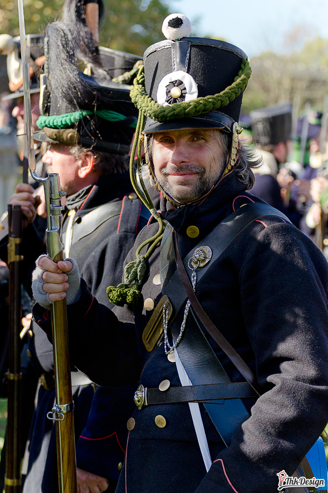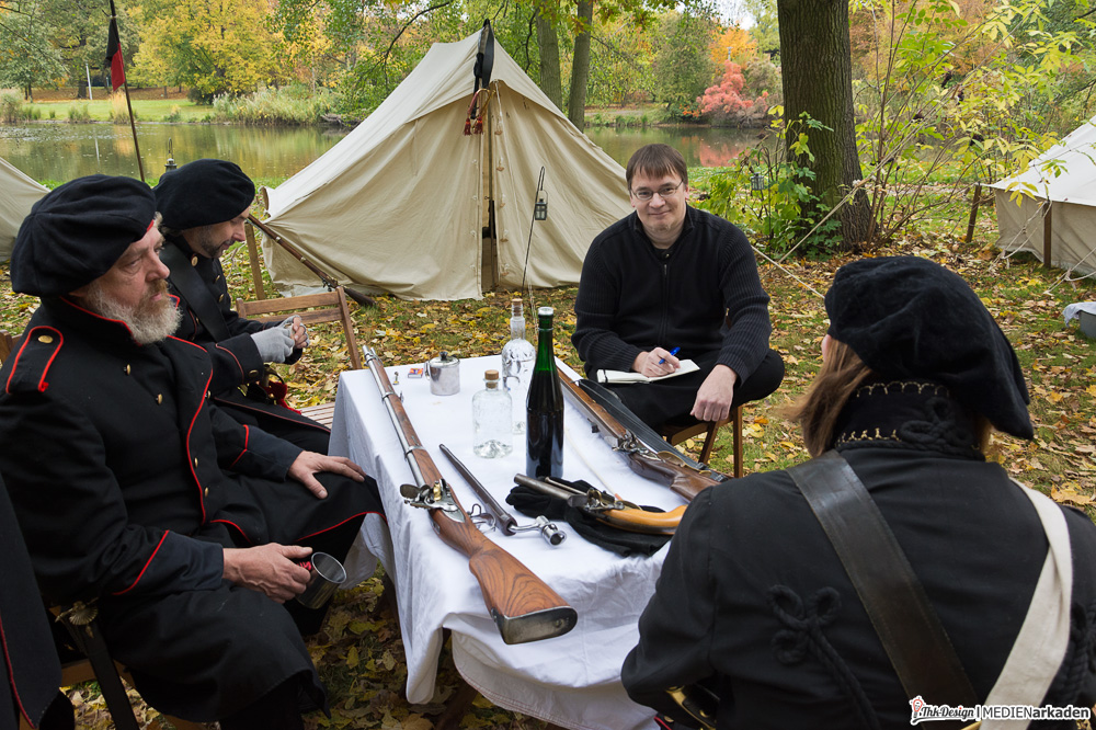 Vor 2 Jahren brachten wir einen kurzen Artikel zur Schlachtdarstellung, letztes Jahr nahmen wir am Bürgerfest am Völkerschlachtdenkmal teil und im August sprach Mathias mit Erik Babak, dem Komponisten des Panoramakunstwerk „1813 – In den Wirren der Völkerschlacht“. Diesmal wollten wir nicht nur Zuschauer sein, sondern auch mit den Menschen reden, welche als Darsteller und „greifbare“ Zeitzeugen jedem aufgeschlossenen Besucher ein sehr eindringliches Bild der damaligen Verhältnisse vermitteln, ob nun im Biwak, historischen Dort oder auf dem „Schlachtfeld“. In Vorbereitung des Jubiläums und der von uns geplanten mehrteiligen Reihe hatte ich Kontakt zu einigen Reenactment Gruppen aufgenommen. Diese zeigten sich sehr aufgeschlossen und so vereinbarten wir Interviews + Fototermine für Freitag, den 18. Oktober.