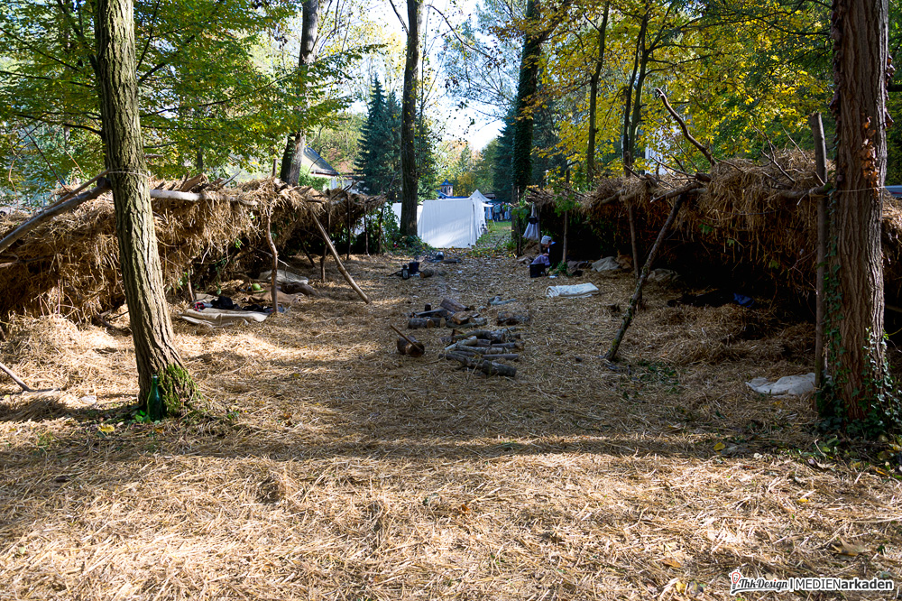 Mit vielen Fragen und einer großen Portion Neugier im Gepäck trafen wir uns kurz nach 9 Uhr am Festanger in Markkleeberg Ost. Thomas hatte wie üblich seine komplette Fotoausrüstung (Stativ, 2 Bodys, mehrere Objektive und Filter) an Bord, ich war mit meinem Notizbuch auf aufnahmebereitem Geist „bewaffnet“. Im gesamten AGRA- und angerenzenden Gelände hatte man Biwakplätze eingerichtet, Pferdeställe, Veranstaltungsbereiche, Exerzierflächen und Marketender untergebracht. Dank Plan gut informiert erreichten wir aber ohne uns zu verlaufen das erste Ziel des Tages.