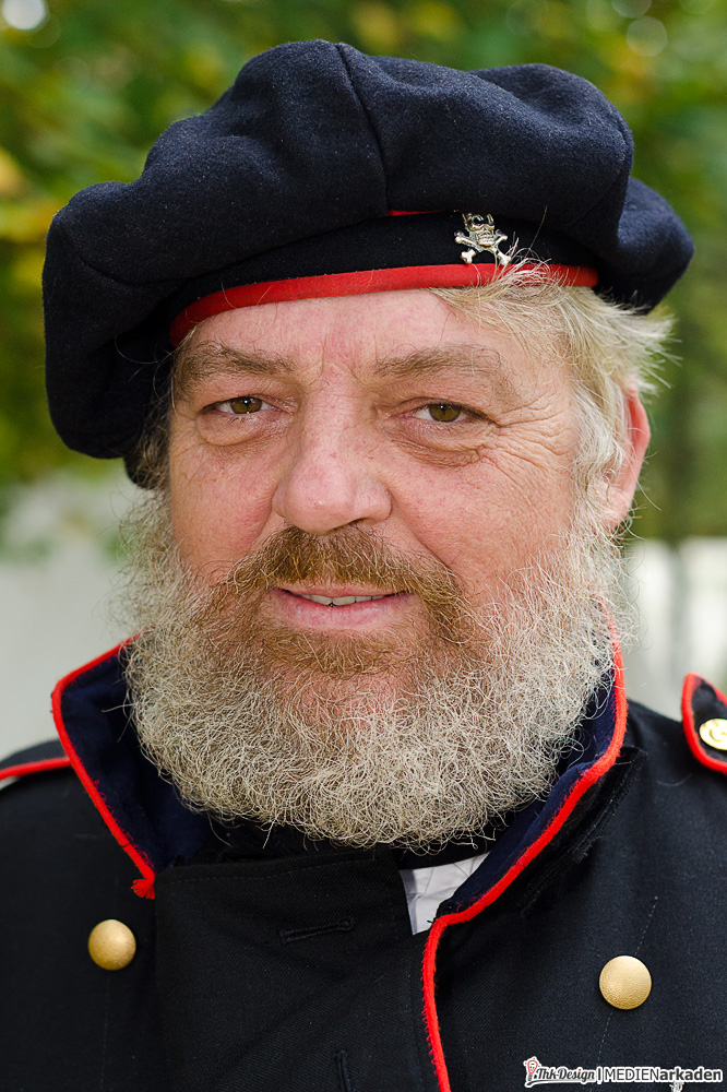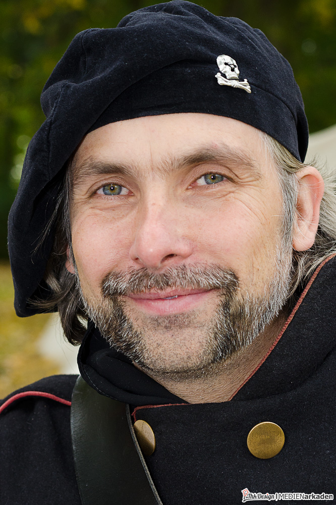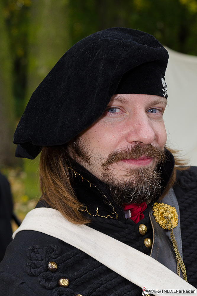 Der größte Geschichte- und Geschichtenerzähler im Lager war Olaf, welcher eine eigene, sehr gut recherchierte Seite zur Historie des Freikorps betreibt. Ihn brachte das Interesse an der napoleonischen Ära und insbesondere an den Lützowern zum Hobby, auch wenn er sich „nebenher“ sehr in der römischen Geschichte zuhause fühlt. Eigentlich stellt er einen Husar dar, mangels mitgereister Pferde blieb er bei den Jägern zu Fuß und machte dort dank typischer aufwendig mit Schnüren verzierter Jacke und pelzverbrämtem Umhang eine besonders schneidige Figur. Von Ihm erfuhr ich erstaunlich viel Neues über historische Begebenheiten, über ehemalige Mitglieder des Freikorps, Ausrüstung und Einsätze.