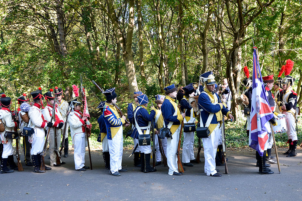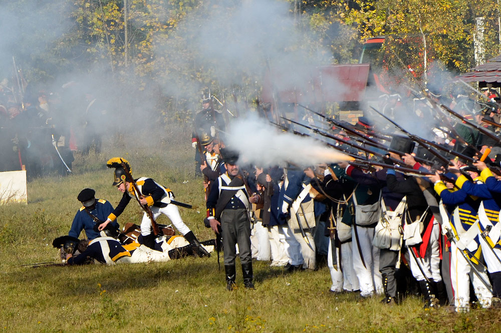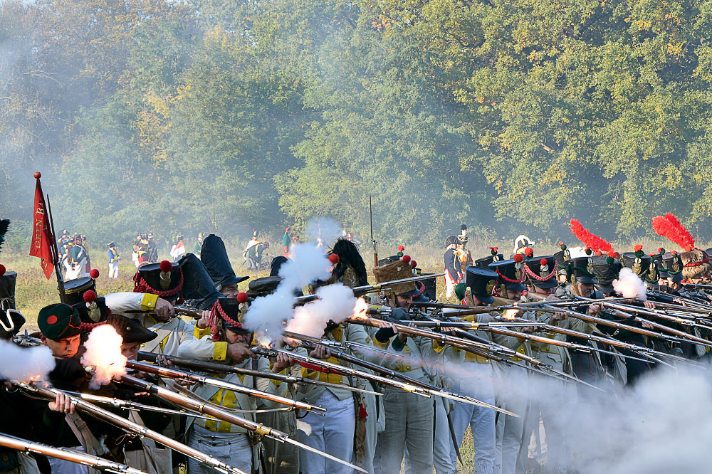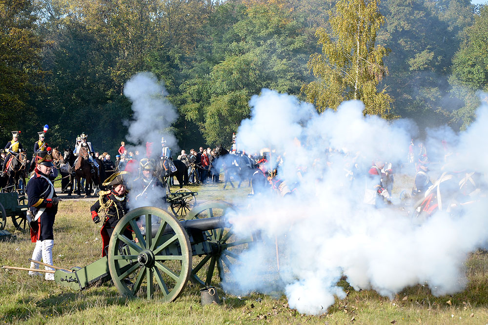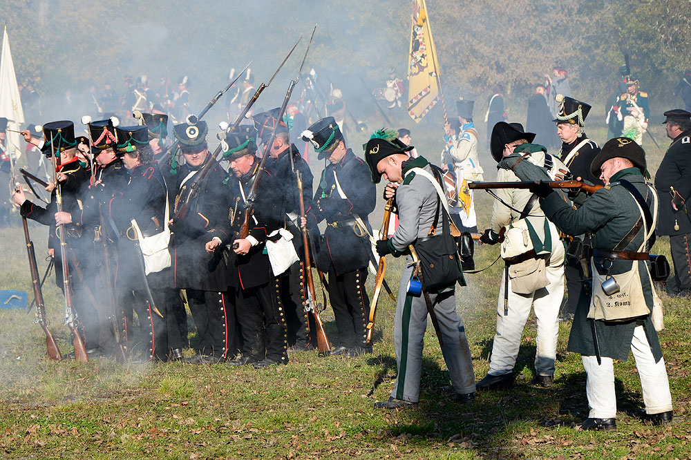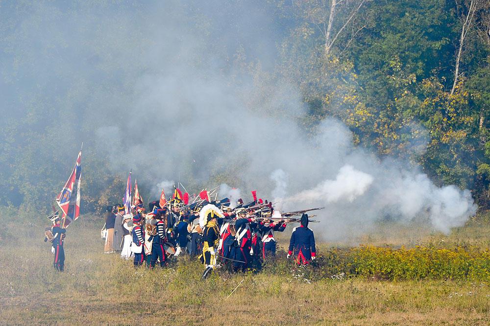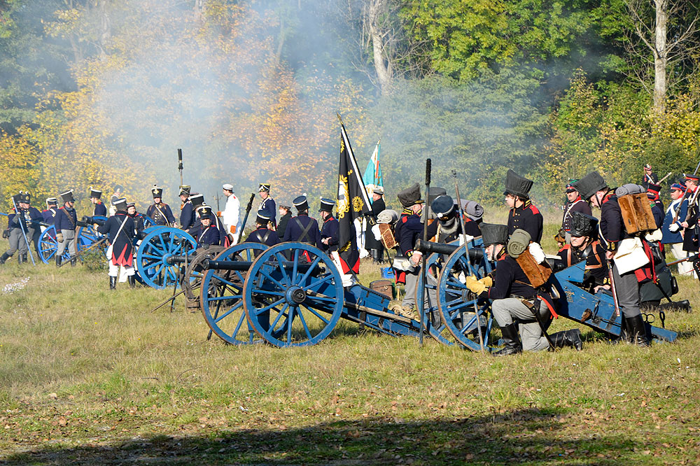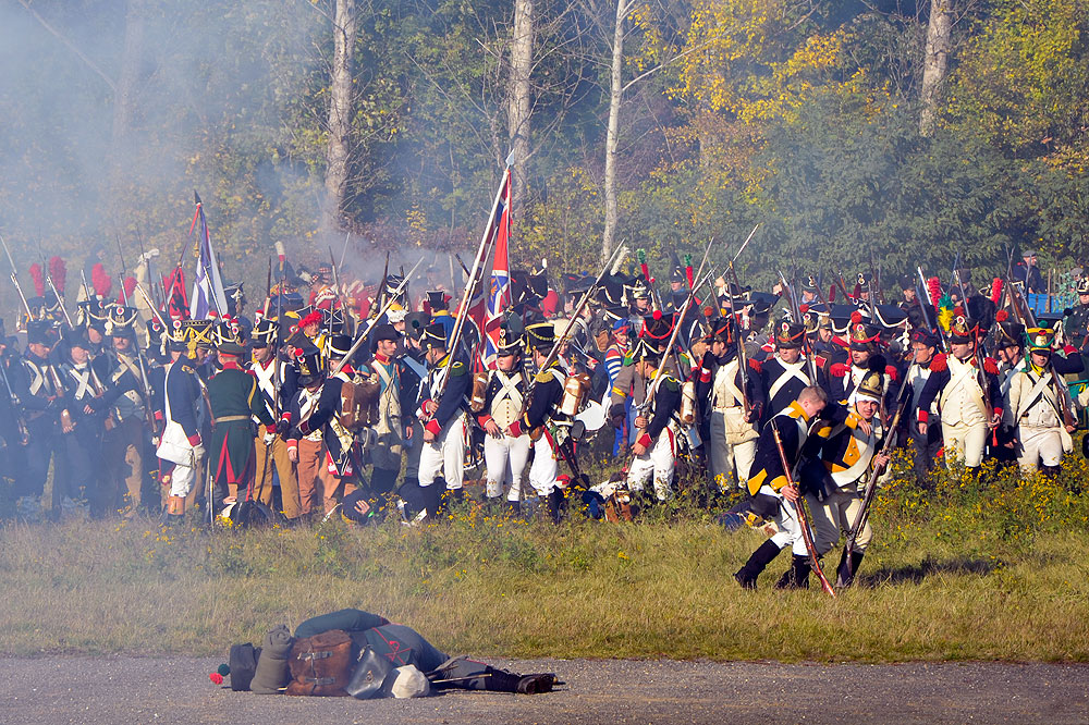 Am interessantesten gestaltete sich natürlich die Schlachtvorführung selbst. Für rund 90 Minuten stritten die „verfeindeten“ Streitkräfte erneut mit Waffengewalt um den Sieg. Die 900 in historische Uniformen gewandeten Freizeitkrieger und Nonkombattanten wurden unterstützt durch 2 dutzend Kanonen und Mörser, sowie eine Handvoll Berittene. Geleitet von Ihren jeweiligen Generälen führten die Beteiligten Angriffs- und Rückzugsmanöver aus, rannten, feuerten, fielen. Schnell legten sich dichte Rauchschwaden über das Schlachtfeld und intensiver Pulvergestank erfüllte die Luft. Gebrüllte Befehle und Waffengeklirr wurde nur übertönt von den – für viele unerwartet – heftigen Kanonenschlägen und dröhnendem Geschützdonner.