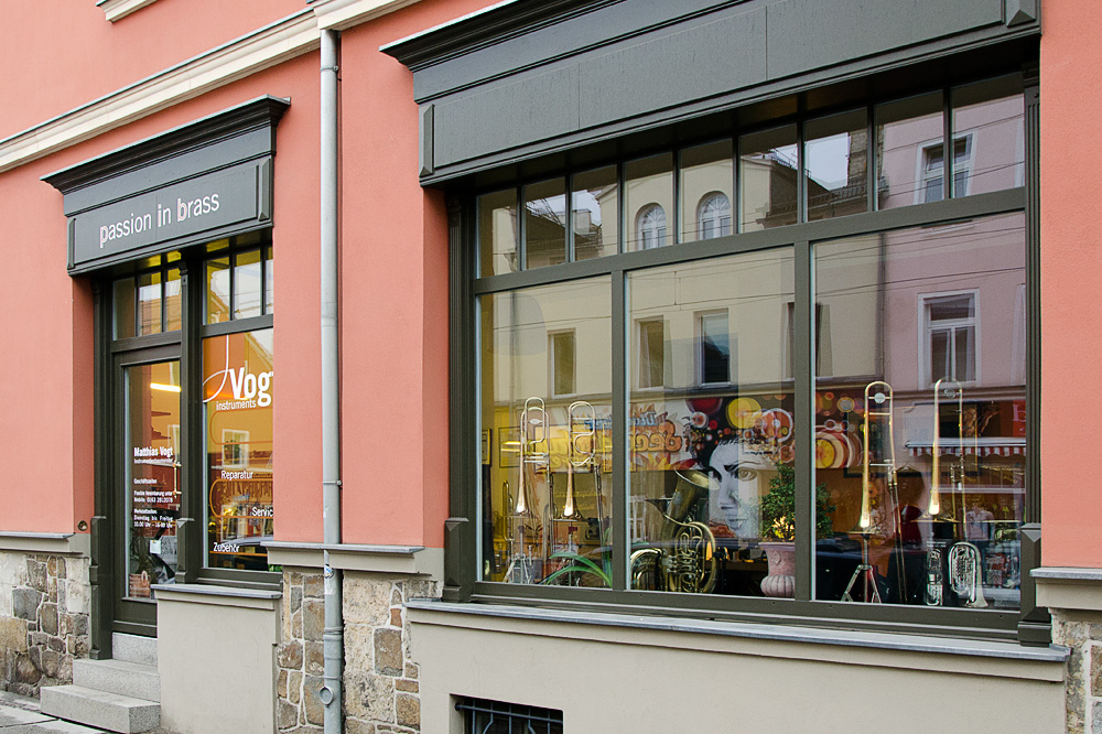 Das schicke Geschäft zieht bereits von außen die Blicke auf sich. Gelegen direkt an einer geschäftigen Hauptstraße, unweit des Plagwitzer Stadtteil-Einkaufszentrums „Elster-Passage“, strömen hier jeden Tag viele Fußgänger vorbei. Mit Sicherheit verirrt sich aber auch der Blick so manches Autofahrers oder LVB-Fahrgasts hin zu den großen hell erleuchteten Fenstern. Was ist also das Besondere daran? Ganz einfach, statt wie so viele andere Handwerker, das Ladengeschäft vorn und die Werkstatt hinten zu haben, dem Kunden also nur die fertigen Produkte zu präsentieren, geht man hier bewusst einen anderen Weg. Präsentationsfläche, Büro und auch die Arbeitsbereiche teilen sich einen gemeinsamen Raum. Während man also einerseits die auf Hochglanz polierten Instrumente bestaunen kann, sieht man andererseits auch wie diese hergestellt, repariert oder gepflegt werden. Man werkelt nicht hinter verschlossenen Türen, sondern lässt sich in die Karten schauen. Ob der großen Fenster kann man auch von außen „Voyeur“ spielen.