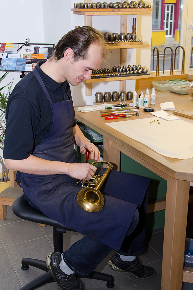 Während der sympathische Leipziger von seiner Passion erzählte, arbeitet sein Mitarbeiter Hr. Dietze konzentriert an der Wiederherstellung einer vielbenutzten Trompete. Reinigen, schleifen, polieren, ausbeulen, ausprobieren, alles in Ruhe, mit sicherer Hand und dem Blick für Details. Seit anderthalb Jahren verstärkt der gelernte Feinmechaniker (der in seiner Freizeit selbst das Horn spielt) das Team von Vogt Instruments und kümmert sich vor allem um die Aufbereitung von Instrumenten. An seiner Person zeigt sich wieder einmal, dass man sich mit einer soliden handwerklichen Ausbildung auch in andere Metiers einarbeiten und darin sehr gut werden kann.