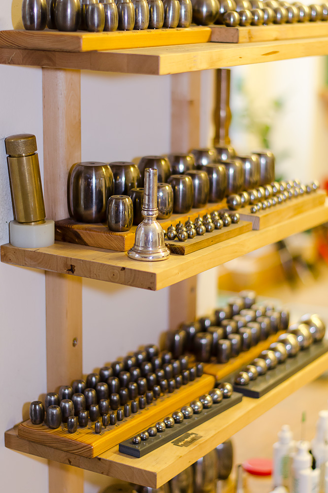 Auch neue „Musizierapparate“ fertigt man in 1- 2 Wochen. Für einen Schalltrichter beispielsweise wird Flachblech mit einer Schablone ausgeschnitten, gefaltet, verzahnt, hart verlötet, geschmiedet, gerundet, aufgedehnt, der Rand abgestochen, umgebördelt, mit eingelegtem Draht verstärkt. Danach gebogen, geschliffen, auf Hochglanz gebracht. Und immer wieder kontrolliert, angepasst, überprüft. Schlussendlich prangt das Logo von Vogt Instruments auf dem goldfarbenen Metall. Wobei das klassische Gold kein Muss ist, sondern durch die Wahl der Legierung auch rötlicher oder weißer schimmern kann. Bei guter Pflege und jährlicher „Durchsicht“ leben die Tuben, Trompeten oder Posaunen dann 20, 30 oder mehr Jahre.