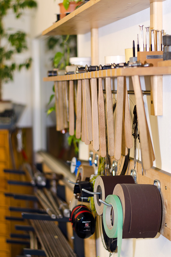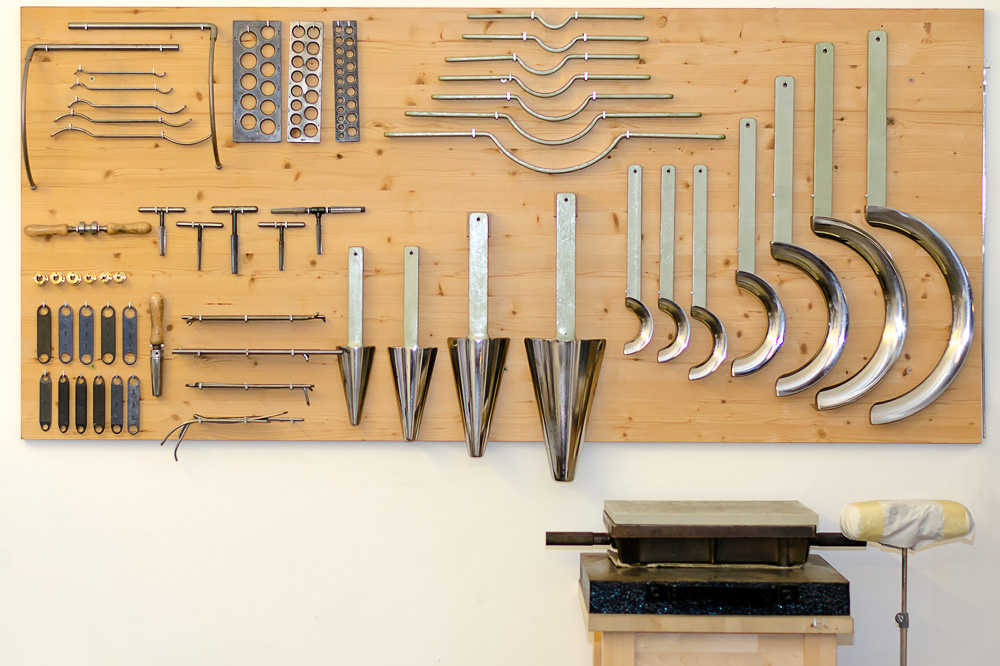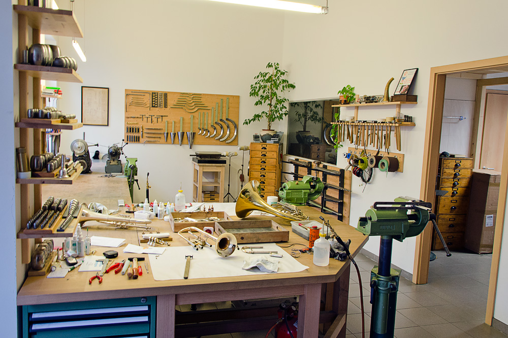 Der Anfang war bescheiden. Nachdem das passende Objekt gefunden war, mussten Werkbänke, Büromöbel, vor allem aber die kompletten Werkzeuge angeschafft werden. Instrumentenbauer kennen natürlich auch normale Hämmer, Feilen, Zangen, arbeiten aber viel und oft auch mit Spezialwerkzeugen, bei denen auch ein gebrauchter Satz schnell einmal mit 20.000€ zu Buche schlägt. Wer sich schon einmal als Existenzgründer probiert hat oder den Weg in die Selbstständigkeit gegangen ist, kann sicher gut nachvollziehen, wie knapp und leer die Kasse in den ersten Monaten oftmals war.