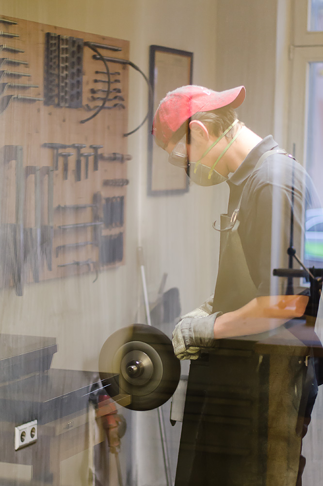 Die Werkstatt ist ein kompakter heller Bereich, die Wände gesäumt von ordentlich aufgereihten Modulen, stählernen Gebilden, Kugeln, Hämmern, Klammen, Zangen usw. aller Größenordnungen. Nicht nur weil man den Blick aufs eigene Handwerk zulässt, herrscht eine auffällige Ordnung und Sauberkeit. Alles wirkt durchdacht und an seinem Platz befindlich, die kurzen Griffwege ermöglichen ein effizientes Arbeiten.