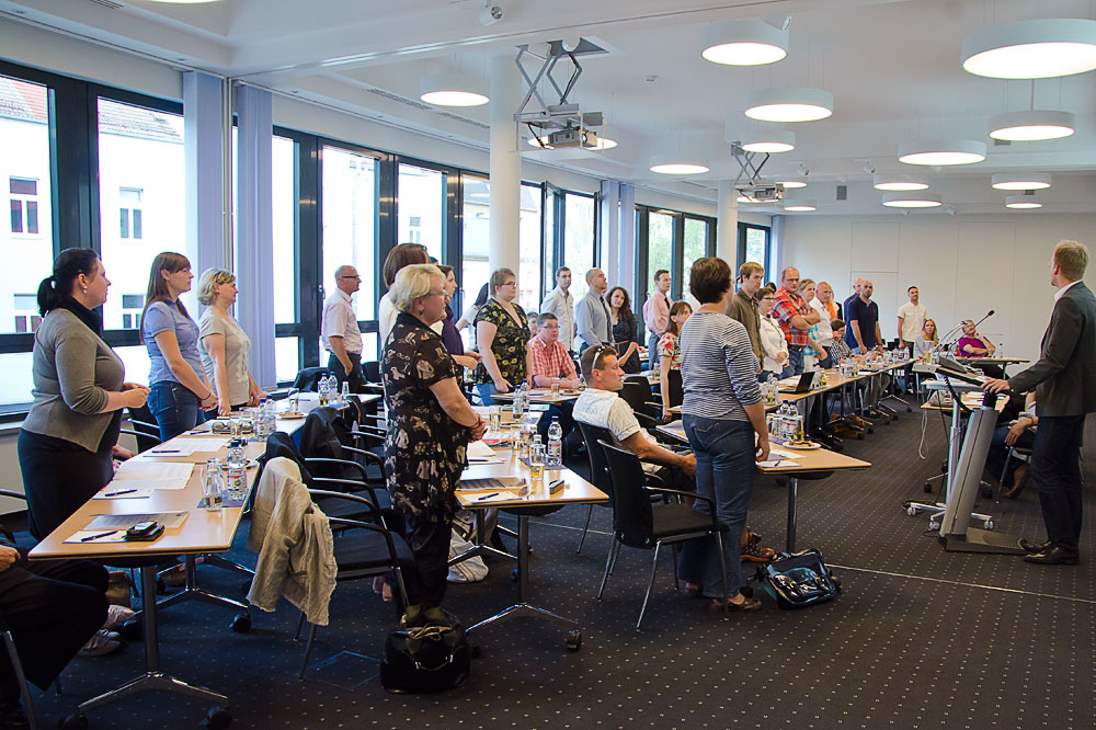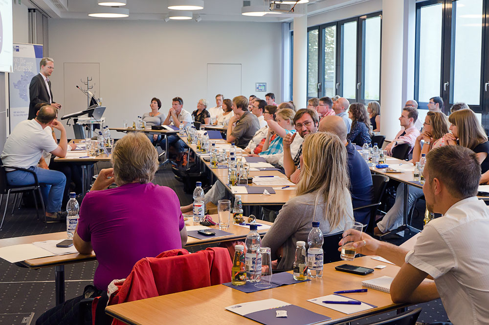 Gemeinsam mit dem Fotografen Thomas Kunert und Manuel Hiemer von M-Solutionis traf ich bereits 1 Stunde vor dem offiziellen Beginn ein und nutzte die Zeit um mich umzusehen. Der positive Eindruck, den das Gebäude selbst hinterließ, setzte sich im Veranstaltungssaal fort. 3 Reihen Tische waren in einem breiten U angeordnet und auf den Tisch der Referenden ausgerichtet. Großformatige Leinwände und 2 Beamer würden im Zusammenklang mit einem Mikrofon für gute Sicht- und Hörbarkeit sorgen. An allen Sitzplätzen standen Getränke, Gebäck, Informations- und Mitschriftmaterial zur Verfügung. Die Besucher wurden im Entree von Frau Kupfer sehr freundlich in Empfang genommen und rasch füllte sich der Saal (fast) bis auf den letzten Platz. Von den 70 Angemeldeten fanden fast alle auch den Weg zur IHK, den Rest komplettierten spontane Teilnehmer.