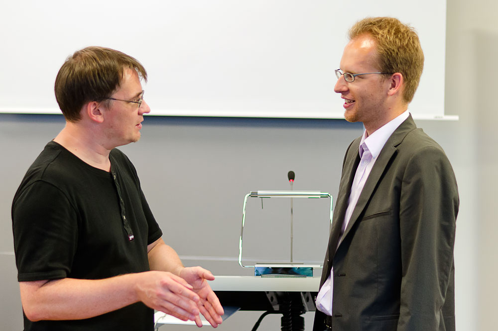 Nachdem deutlich mehr als die angesetzten 2 Stunden vergangen waren, beendete Hr. Möslein schließlich den offiziellen Teil und lud zu zwanglosen Diskussionen im Saal und rund um die davor aufgebauten Stehtische ein. Die Gelegenheit wurde ausgiebig genutzt und die Vortragenden waren noch eine ganze Weile dicht umlagert. Auch für uns ergaben sich noch mehrere Gelegenheiten um über das Thema zu sprechen, neue Kontakte zu knüpfen und Fotos zu machen. Wir verließen mit den Letzten den Saal, mit vielen neuen Eindrücken und zufrieden mit der gelungenen Veranstaltung.