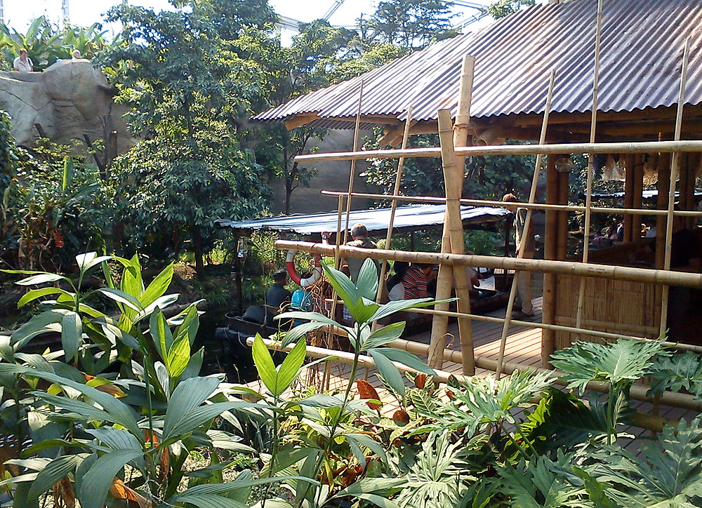 Wieder im Tageslicht findet man sich sofort im Dreh- und Angelpunkt der Tropenhalle wieder. Das Pfahldorf lädt zum verweilen ein, zum essen, trinken, pausieren, Stimmung genießen. Fürs leibliche Wohl ist gesorgt, nette Zoolotsinnen helfen bei Orientierungsproblemen und beantworten geduldig Fragen.