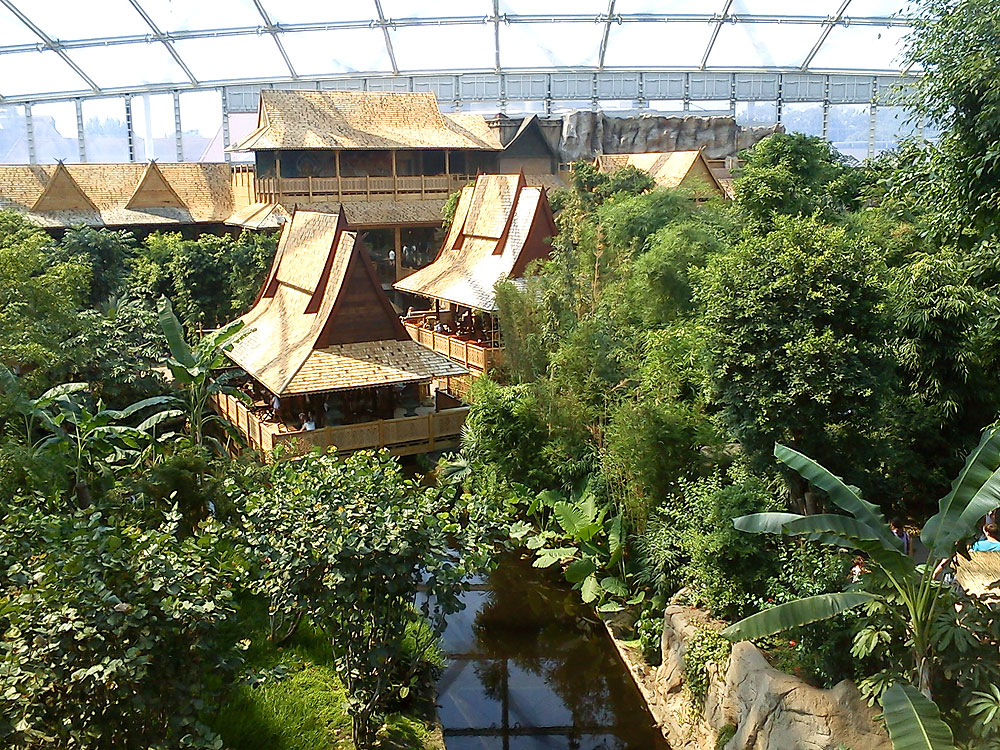 Später schafften Tieflader riesige tropische Bäume und Gewächse heran. Vom (noch nicht zugänglichen) Haupteingang der Halle erhaschte man weitere Blicke. Dabei beeindruckten mich bereits damals die unfertigen Gestaltungselemente. Ob Wände, Boden, Decke, Versorgungsanlagen (Belüftung in künstlichen Baumstämmen), Gebäude etc, alles ist aus einem Guss, passt stilistisch zueinander. Einem asiatischen Tempel nachempfunden wird man (später) direkt ins Herz der Halle geleitet werden.