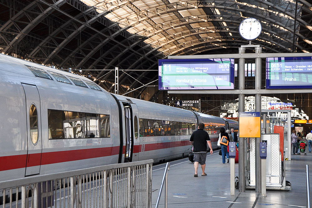 Am 26. Mai war es dann soweit. Wir stellten unser Auto im Parkhaus West des Leipziger Hbf. ab (1 Tag = 3 €) und befanden uns schon 5 min später an Gleis 11. Der ICE 794 stand bereits bereit und wir konnten unsere reservierten Plätze in Beschlag nehmen. Das Abteil wartete mit bequemen Sitzen, einem Tisch und Steckdosen auf. Zur Unterhaltung lagen das DB-Magazin und ein Reiseplan (Your Travel Guide) mit sämtlichen Reiseinformationen der 451km langen Strecke, aus.