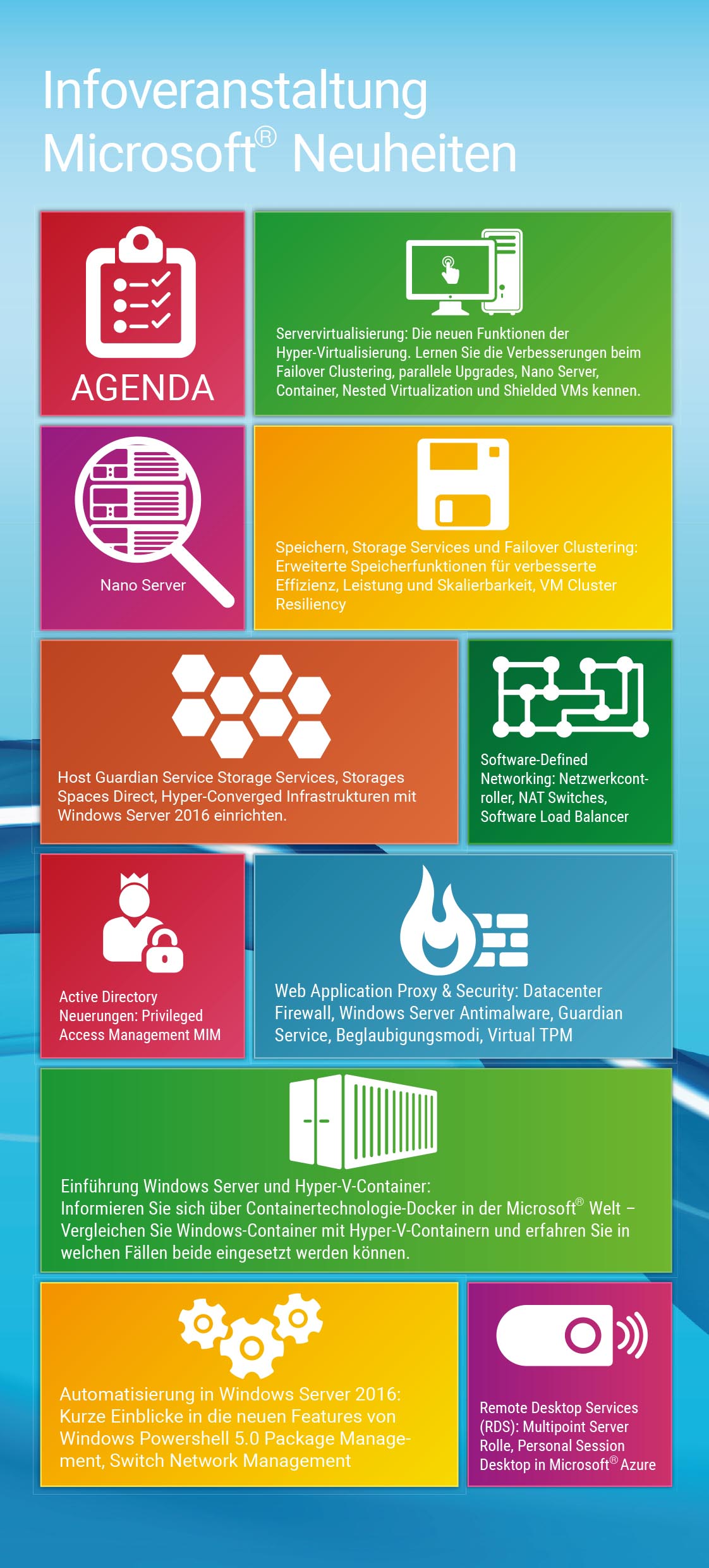 Kommen Sie nach Kassel zu unserem Server Frühstück. Erfahren Sie mehr über die neuen Funktionen der Hyper-Virtualisierung. Lernen Sie die Verbesserungen beim Failover Clustering, parallele Upgrades, Nano Server, Container, Nested Virtualization und Shielded VMs kennen.