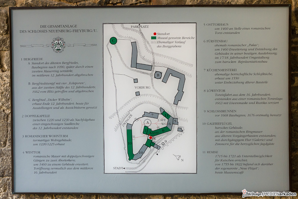 Die Unstrut überquerend, bogen wir rechts in die 2. Straße, passend Schloßstraße genannt, ab. Dort findet man u.a. auch das Turn- und Sportmuseum „Friedrich Ludwig Jahn“, welches sich dem Wirken des „Deutschen Turnvaters“ widmet. Bald wird aus der Straße mehr ein Weg, welcher sich – Geländer-gesichert und beleuchtet – bergauf windet. Selbst mit Gepäck sind die Höhenmeter kein Problem und nicht zu vergleichen mit den steilen Aufstiegen wie man sie im Elbsandsteingebirge findet. Nach einer Biegung hat man wieder freie Sicht aufs Tal der Unstrut, kann unterhalb der Ringmauer eine kurze Rast einlegen oder gleich weiter ins Burginnere vordringen.