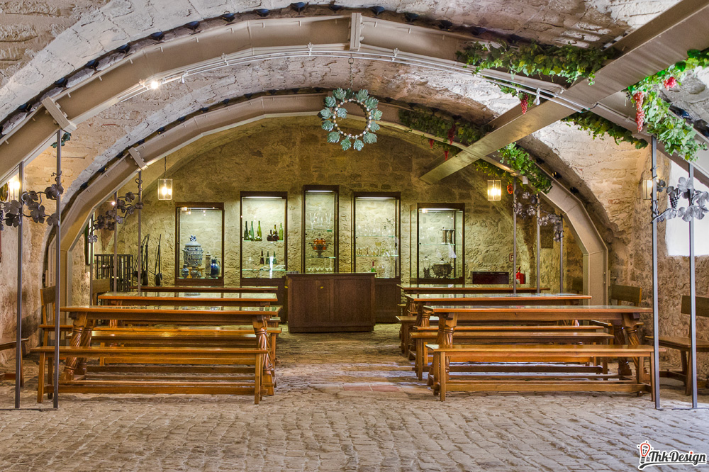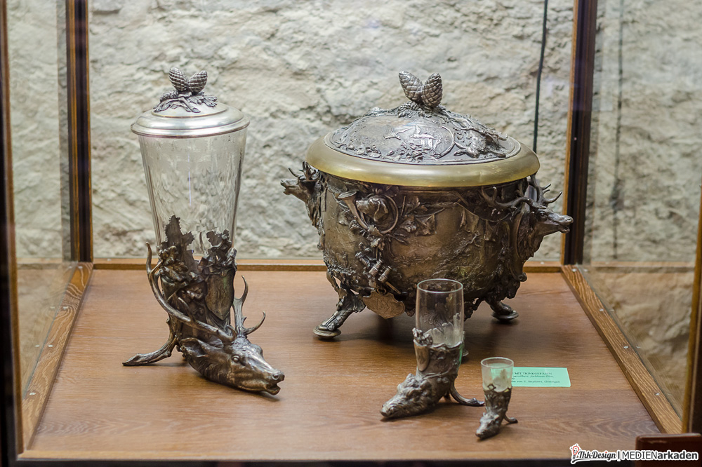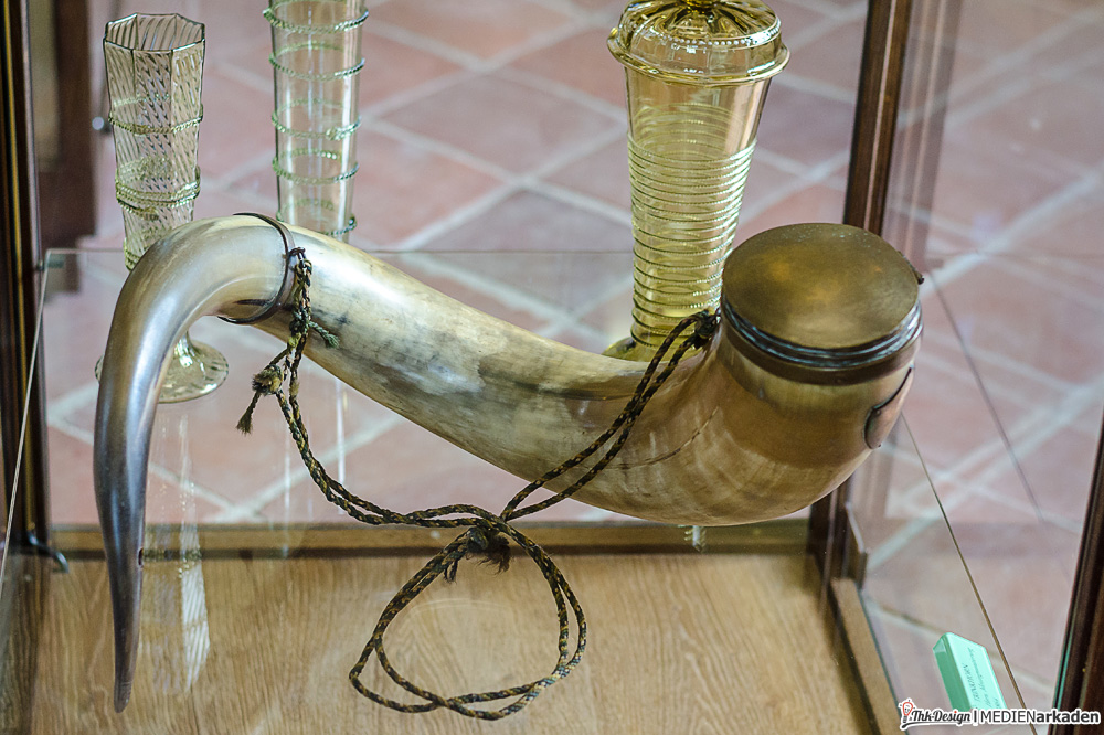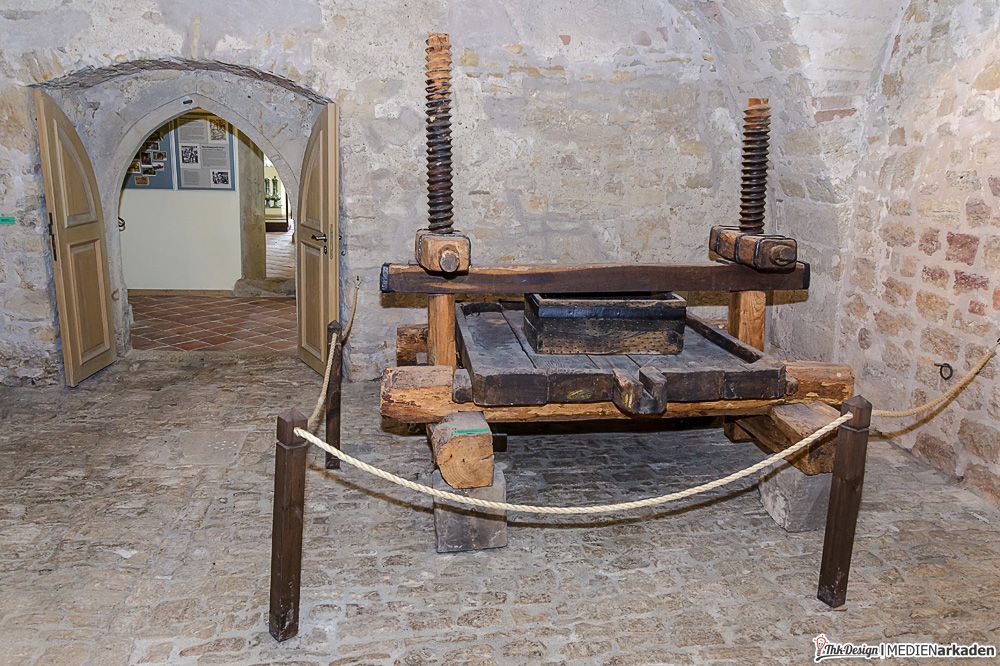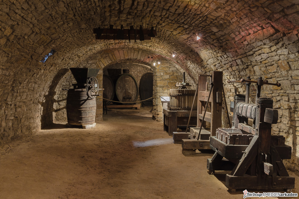 Das Weinmuseum entpuppte sich als großzügiges mittelalterliches Tonnengewölbe und prima Ort um sich im Sommer abzukühlen oder im Winter hinter dicken Mauern im Warmen zu sitzen. Die Decke ist mit Stahlträgern untermauert und wird mit Dämpfern abgefangen. Auf den ersten Blick fällt diese Sicherungsmaßnahme aber kaum auf, dafür sorgen gebogene Formen und dekoratives (künstliches) Weinlaub. Ausgestellt werden Weingläser, Kelche, Flaschen und Trinkgefäße aller Art. Erklärende Tafeln und Bilder lassen kaum Fragen offen. Eine ganze Reihe Infotafeln beschäftigen sich mit den seltenen Riesenfässern, wie der Herkulestonne (ehemals auf der Festung Königstein). Seit 1998 widmet man sich hier dem Thema Wein und zeigt auch Weinpressen, Fässer, Prunkbutten und eine Doppelspindel-Weinkelter von 1584. Regelmäßig finden Weinproben statt und auch sonst eignet sich diese Örtlichkeit unserer Meinung nach bestens für Veranstaltungen wie Lesungen und kleinere Konzerte, denn das Gewölbe verströmt Gemütlichkeit pur.