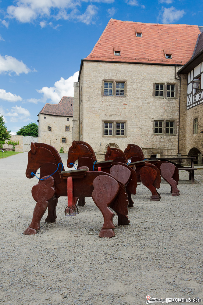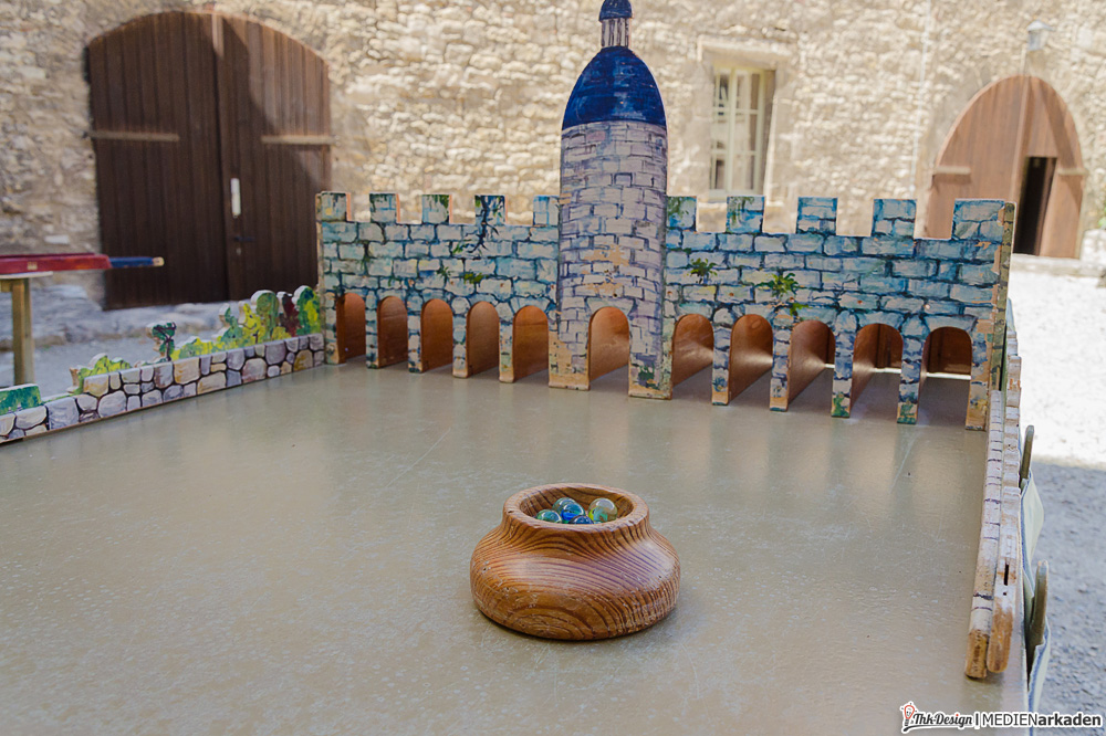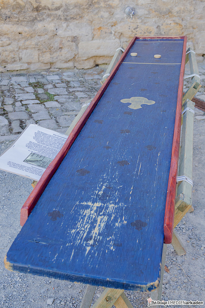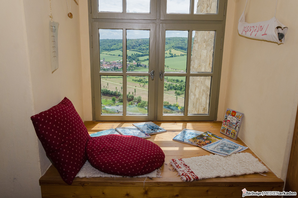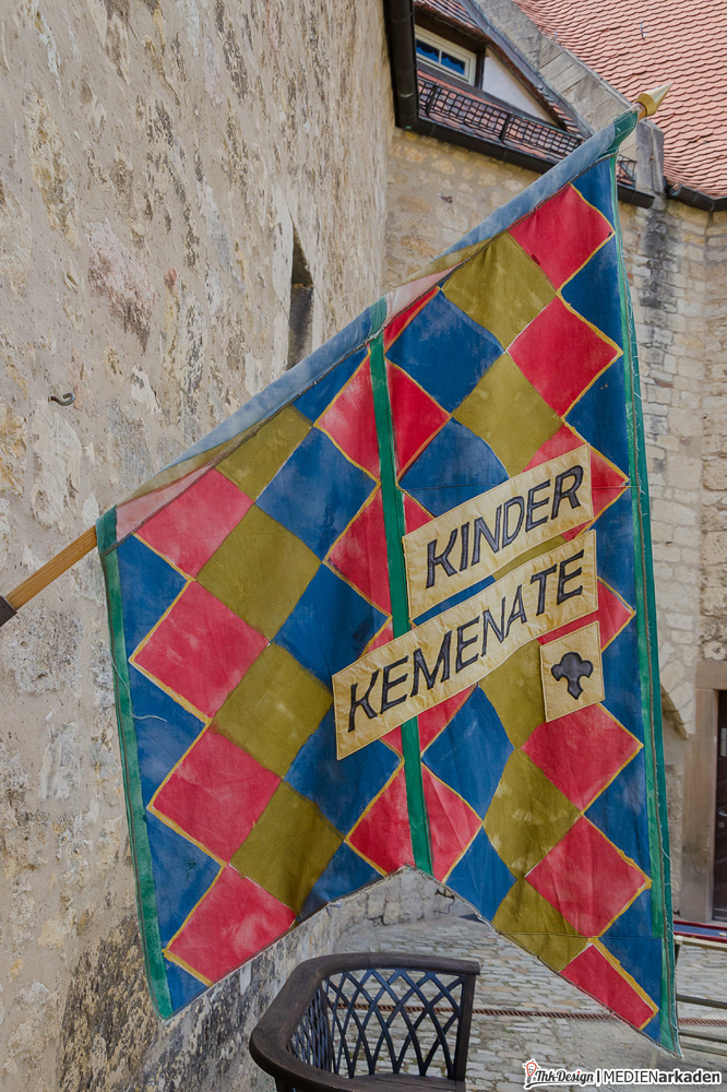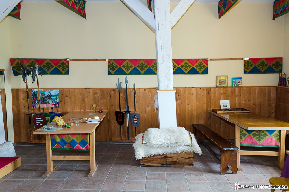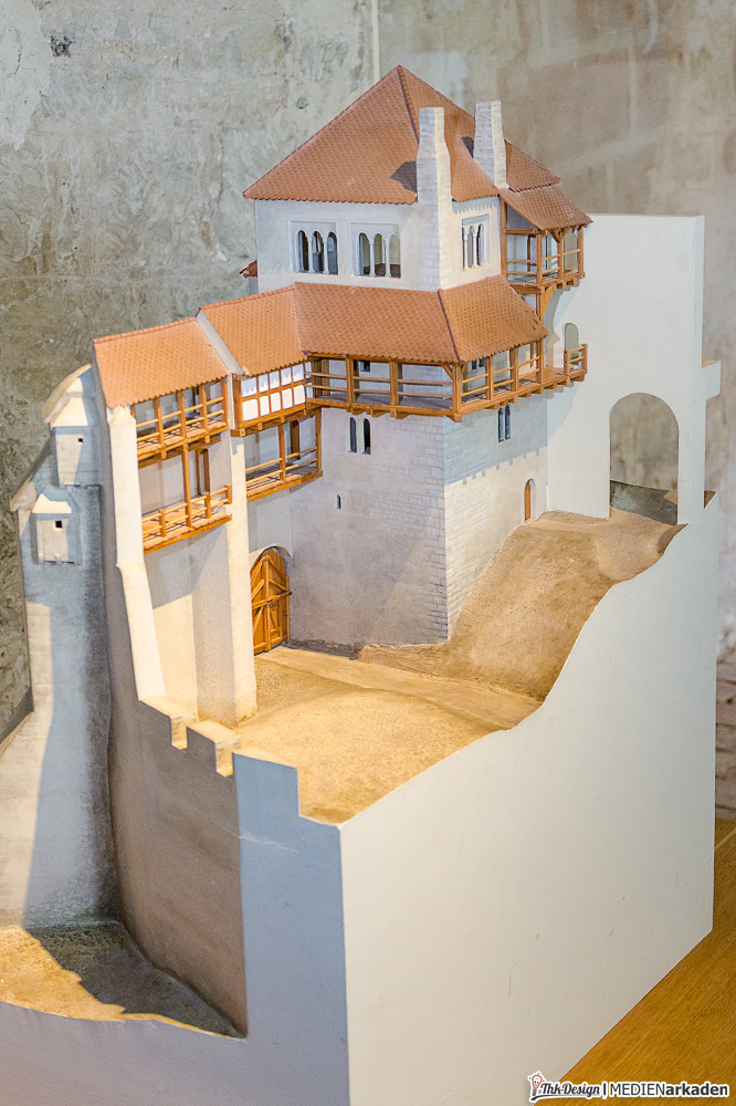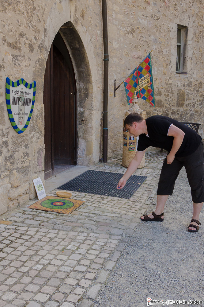 Die Kinderkemenate ist weniger Ausstellung als vielmehr lebendiges Mittelalter. Zum Leben erweckt wird der Bereich von der Museologin Elen Keindorff, welche sich seit 2012 mit viel Hingabe darum kümmert, Sagen und Geschichten der Thüringer Landgrafen zu vermitteln. Auch wenn dieses Angebot vor allem von Kinder(gruppen) wahrgenommen wird, so bindet man doch auch die Erwachsenen mit ein, lässt alle Anwesenden in Rollen schlüpfen und z.B. im Thronsaal Mittelalter spielend erleben. Die Räume hier sind besonders lichtdurchflutet, gemütlich, mit breiten Fensterbänken und Blick ins Tal. Bei vielen Dekorationen, Kostümen, Schilden, Waffen, Büchern etc. handelt es sich um Sachspenden. Träger dieses Bereiches ist „Arbeit und Leben Thüringen e.V., eine anerkannte Bildungseinrichtung. Wem es innen dennoch zu eng wird, findet vor der Kemenate Beschäftigung. Eine Handvoll mittelalterliche Spiele (Wurfspiel, Torspiel, Schiebebrett, Holzpferdtjosten u.a.) stehen jedem Besucher offen und werden auch gern von den Erwachsenen getestet. Wir hatten ebenfalls eine Menge Spaß damit.