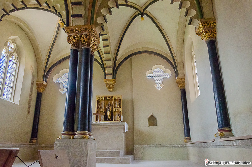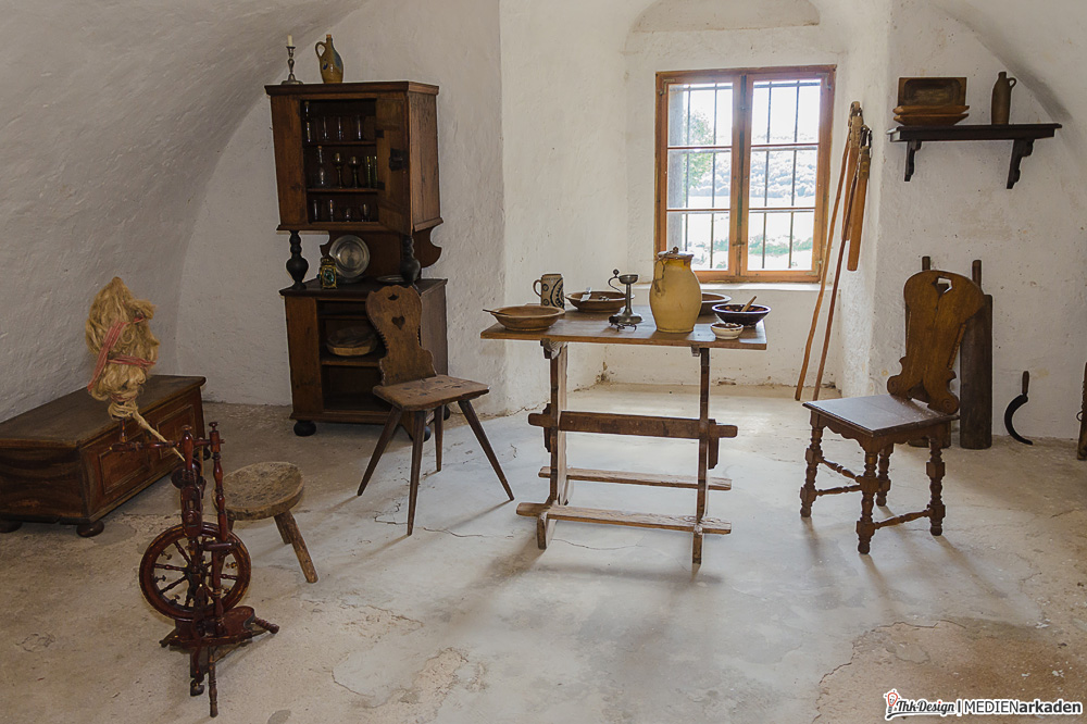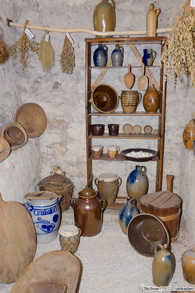„Burg und Herrschaft“ ist der Name der weitläufigsten Ausstellung, welche sich über mehrere Türme, Flügel und Etagen erstreckt. Man beginnt den Rundgang in der Doppelkapelle, welche 2 übereinanderliegende Andachtsräume enthält. Neben Baugeschichte und Historie der Region und der hier ansässigen Herrschaftshäuser, erfährt man viel über die damalige Wohnkultur, das Fürstenleben und wohl einzigartig, die Geschichte der Latrinen. In den Erdgeschossen durchquert man ehemalige Vorratskammern, Gesindestube und Küche, kann Essbesteckweißheiten lesen, Ausstellungen von Keramik betrachten und im Keller wechselnde Ausstellung von Künstlern bewundern. Eine Etage höher sieht man die erste Warmluftheizung der Welt, feingearbeitete Modelle der Burg, Exponate freischaffender Künstler und den Latrinenturm mit Regenwasserspülung. Am Aborterker mussten wir über die witzigen Sprüchlein der Sammlung „Bedenkenswertes für davor, danach und zwischendurch“ schmunzeln. Das Turmgeschoß zeigt Lebensräume in der Neuenburg von Renaissance bis Barock. Zum Beispiel die rauchfrei beheizbare luxuriöse Bohlenstube aus dem 15. Jahrhundert. Besonders prunkvoll bietet sich der Fürstensaal dar, welcher zugleich auch der größte alle Räume ist und unübersehbar der Präsentation von Macht und Reichtum diente. Riesige Gemälde, verspielte Sitzmöbel und massive Schränke gibt es zu sehen.