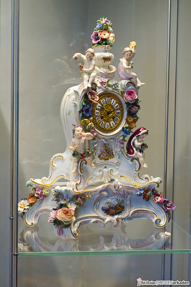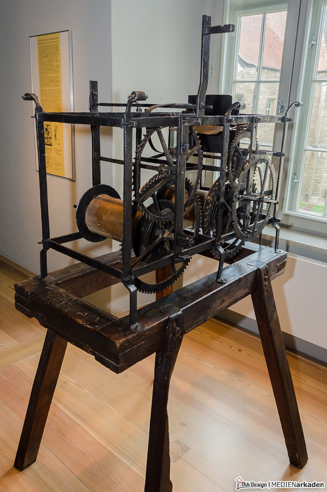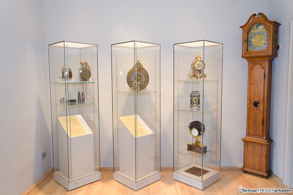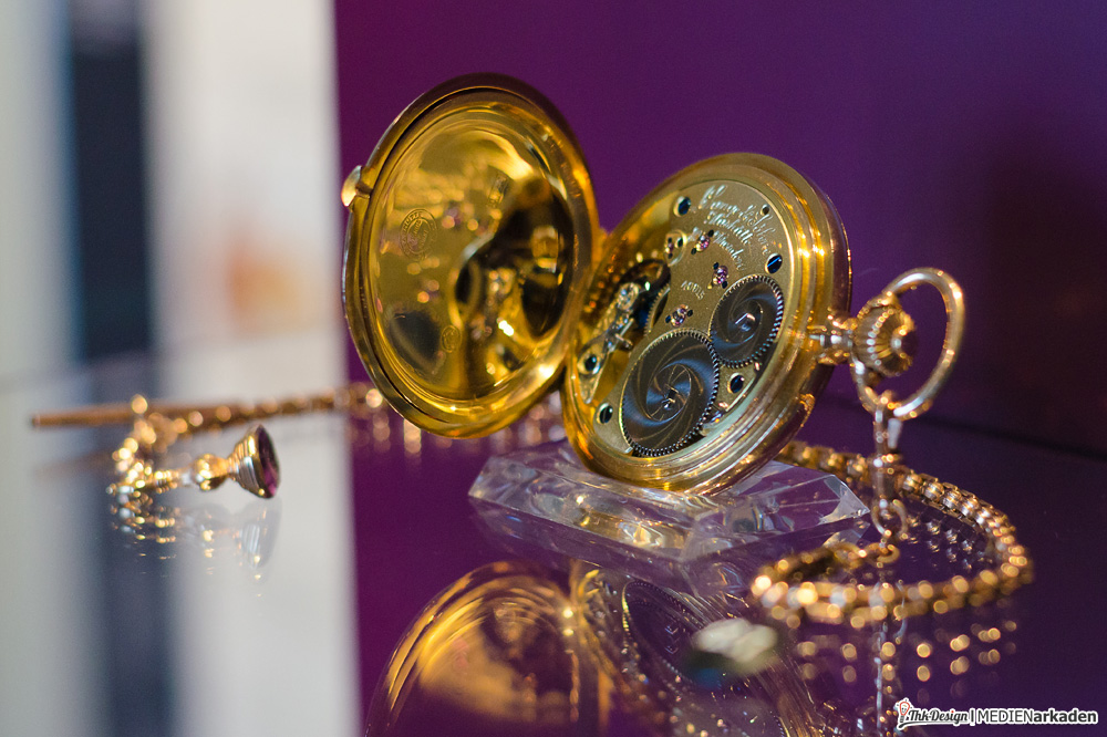 Wunderwerk Taschenuhr ist in den ehemaligen Wohnräumen des Schlossherren angesiedelt. Man zeigt Räderuhrwerke (lesen Sie dazu auch folgenden Beitrag), Wanduhren, Telleruhren, Reiseuhren, Damen- und Herrentaschenuhren. Die einzelnen Stücke sind oftmals Unikate, sehr aufwendig gestaltet und aus glänzendem Gold. In einem kleinen Vorführraum läuft eine Dokumentation „Geschichte der Zeitmessung“, welche in 20min von den Ursprüngen bis heutzutage alles abdeckt. Wussten Sie z.B., dass erst ab 1700 die Zeit sekundengenau gemessen werden konnte, während der Französischen Revolution versucht wurde die Dezimalzeit (100sek = 1min, 100min = 1std, 10std = 1Tag) einzuführen, erst ab 1893 mittels internationaler Übereinkunft eine Zonenzeit eingeführt wurde, während man bis dahin nach der wahren Ortszeit (welche sich am Sonnenstand orientiert) lebte? Ab 1930 setzte sich die Armbanduhr weltweit durch und ist bis heut für Frauen und Männer gleichermaßen nützliches und kleidsames Accessoires. Alle gezeigten Stücke stammen im Übrigen aus einer privaten Sammlung, welche komplett dem Museum gespendet wurde, unter der Auflage diese der Öffentlichkeit in der Neuenburg zugänglich zu machen.