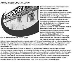 Das Ende vom Lied war, dass es nach einem halben Jahr der Suche immer noch keinen Job gab. Anstatt Trübsal zu blasen, besonn ich mich auf das Gewerbe, das ich während des Studiums angemeldet hatte, um diverse Auftragsarbeiten abzurechnen. Für Aufträge im Bereich Corporate Design, Projekt- oder Marketing-Management und Kommunikation gab es Referenzen. Diese Referenzen nutzte ich, um selbige Leistungen in Halle und Umgebung anzubieten. Erste Miniaufträge kamen zustande. Bis…ja bis der Weg tatsächlich wieder zurück zum Eishockey führte. Durch einen Flyer eines Gründerzentrums in Halle wurde ich darauf aufmerksam gemacht, dass innovative Projekte in Sachsen-Anhalt besonders betreut und gefördert werden. Das Thema der Diplomarbeit (möchte ich hier jetzt nicht auch noch erläutern) brachte mich darauf, eine Online-Software für den Profisport Eishockey zu entwickeln, mit besonderer Ausrichtung für Scouting und Saisonplanung. Zusammen mit dem Gründernetzwerk Univations wurde ein Konzept erarbeitet und Förderung beantragt. Die Förderung wurde bewilligt und alle Aufmerksamkeit galt nun dem neuen Projekt. Zielstrebig wurden Software und Businessplan erstellt. Der Verlauf war zunächst so positiv, dass im Mai 2009 die Scoutractor GmbH gegründet wurde und damit das Projet zur Firma wurde. Während der Zusammenarbeit mit unserem Betreuer von Univations ereignete sich etwas völlig unerwartetes und unvorhersehbares: