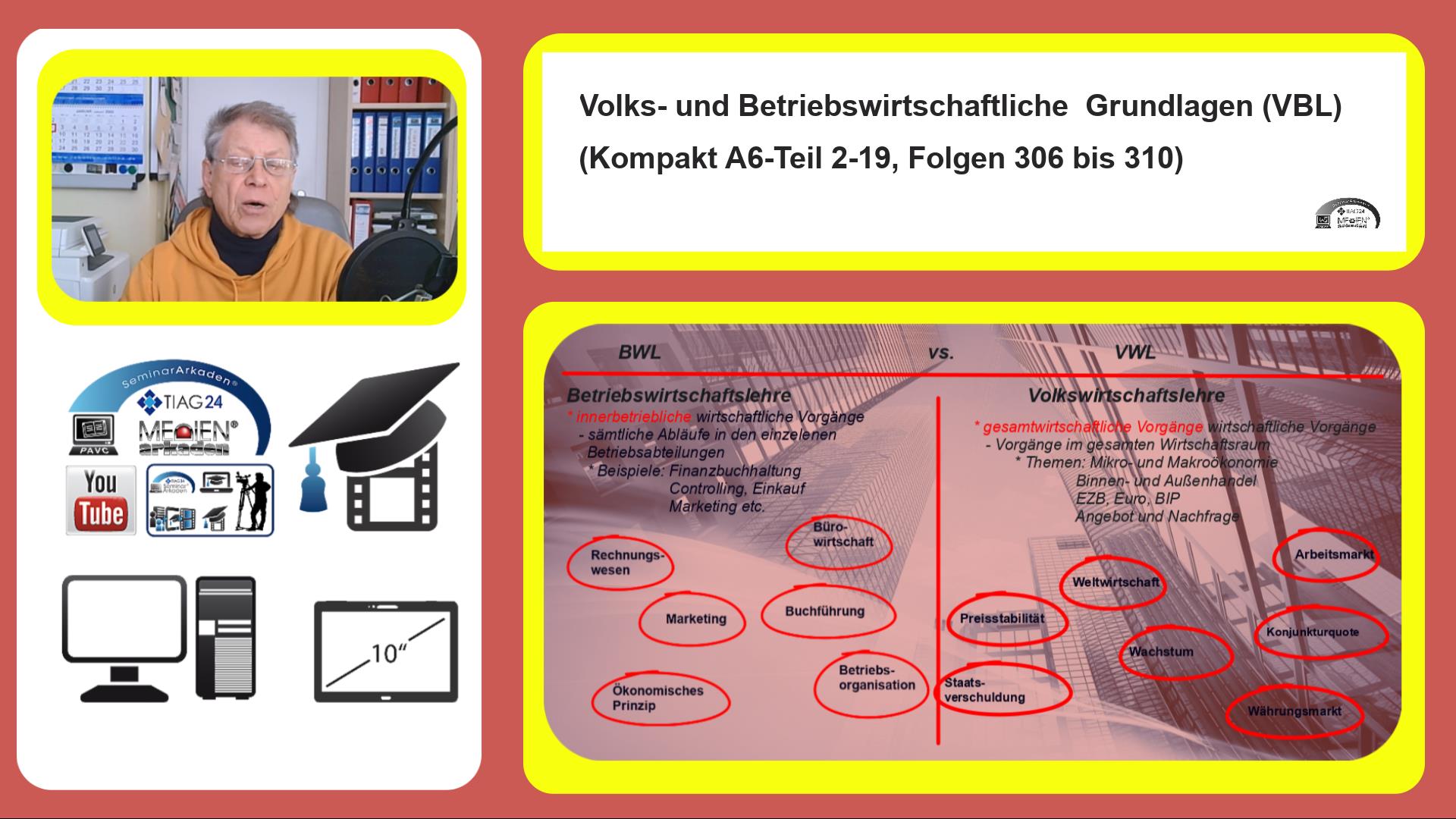 Im Kompaktkurs „Grundlagen Volks- und Betriebswirtschaftslehre / BWL-VBL_mv-TIAG-Kompakt A6-T2-19-306 bis 310-Lz1-41-16-Mld130-70F-V3a4 werden „Aspekte der allgemeinen Volks- und Betriebswirtschaftslehre“ in kompakter Form der im Lernvideo enthaltenen 5 Lernbausteine (LB) einführende Inhalte zur Darstellung und Erläuterung der Begriffe, Inhalte Ziele und Aufgaben des Themenbereiches aufgezeigt, dargestellt und erläutert. Dazu gehören: