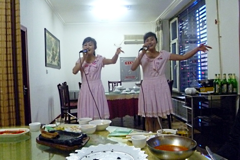Gestern Abend aßen wir im nordkoreanischen Restaurant. Es war ein kurzweiliges Essen mit süßen Reiskuchen (warm) – eingelegtem Chinakohl (kalt) – Rührei mit Spinat(?) – Geschnetzeltem mit Gemüse – gebratenem Fisch (ehemals warm) – hauchdünnem Tang (kalt) – Barbecue-Fleisch mit Knochen. Dies alles kreiste auf dem Karussell zum abwechselnden Verzehr (natürlich mit Stäbchen). Abschließend folgte eine kleine Gemüsesuppe mit Fleisch (heiß). Dazu Reis-Bier in 0,1cl-Gläsern – auch damit kann man eine Flasche leeren. Extra für mich servierte man eine große Schüssel kalter saurer Nudeln – auch diese mit Stäbchen zu essen. Die Auswahl der Speisefolge hatte eine ganze Weile in Anspruch genommen und die hübsche Kellnerin in der typisch zartrosa Nationaltracht geduldig am Tisch ausgeharrt. Während des geschmackvollen Essens gaben die zwei nordkoreanischen Kellnerinnen noch eine nette Gesangseinlage.