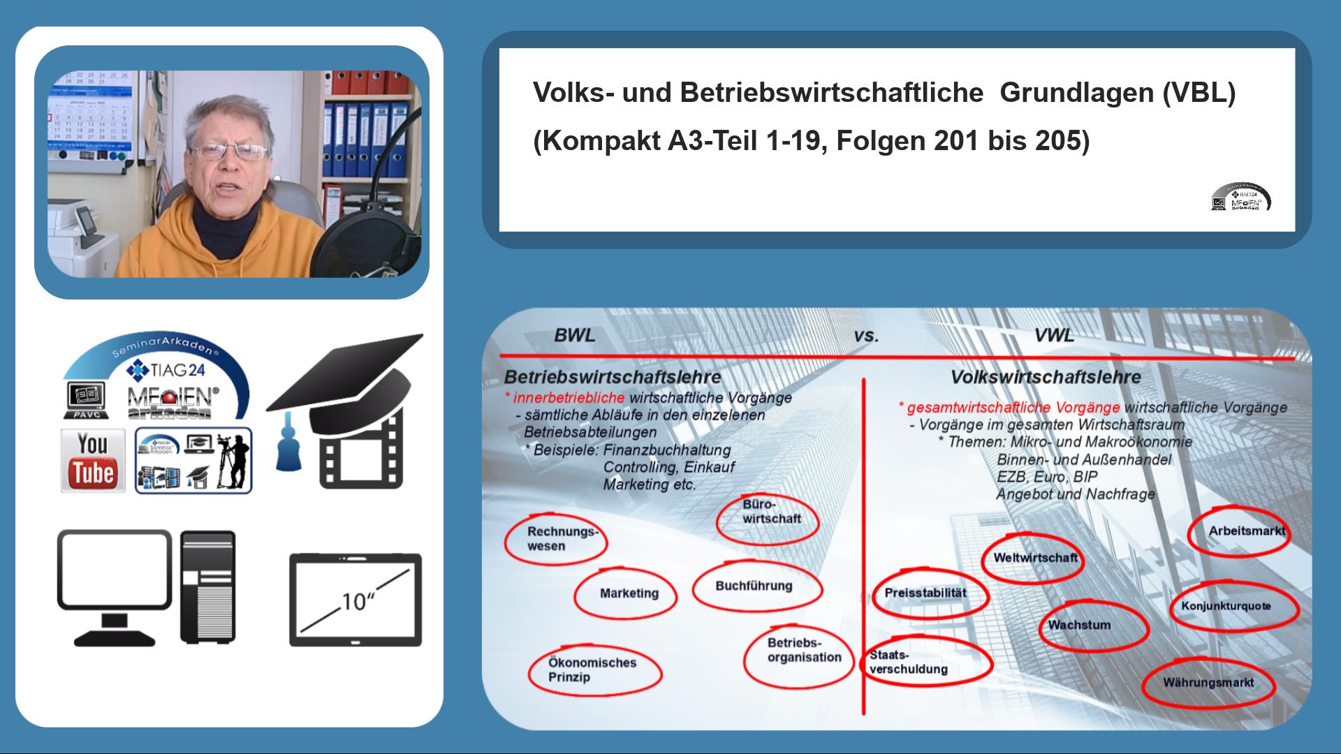 Im Kompaktkurs \“Grundlagen Volks- und Betriebswirtschaftslehre / BWL-VBL_mv-TIAG-Kompakt A3-T1-19-201 bis 205-Lz1-28-25-Mld100-65F-V3b\“ werden \“Aspekte der allgemeinen Volks- und Betriebswirtschaftslehre\“ in kompakter Form von 5 Lernbausteine (LB)
