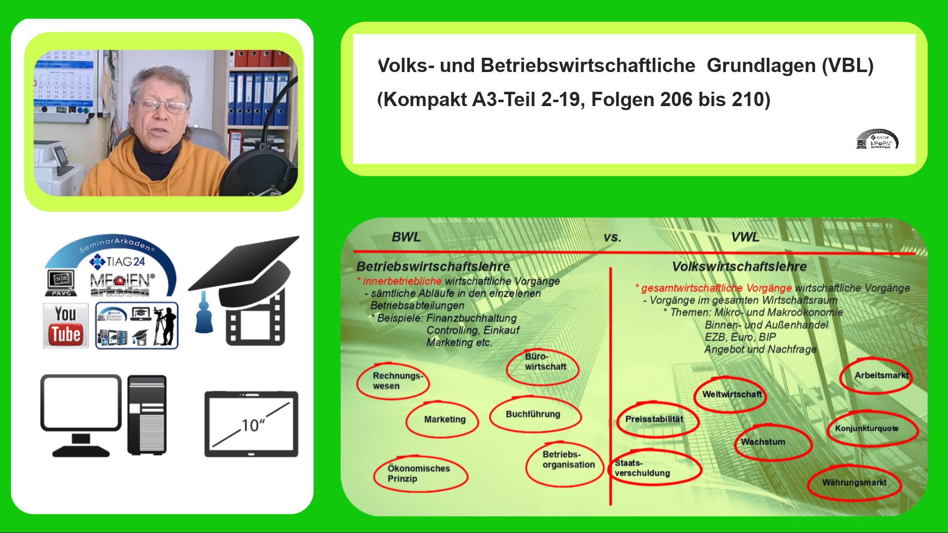 Im Lernvideomodul Grundlagen Volks- und Betriebswirtschaftslehre, BWL-VBL_mv-TIAG-Kompakt A3-T2-19-206 bis 210-Lz1-28-Mld95-63F-V3c werden in kompakter Form der im Lernvideo enthaltenen 5 Lernbausteine (LB) die Themenbereiche: